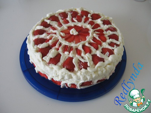 Выложить на корж 1/3 крема. На крем по всему коржу поставить целую клубнику. Выложить еще 1/3 крема. Положить второй корж. Выложить оставшийся крем и поставить торт в холодильник. (Примерно на 2 часа). Затем бортик удалить.