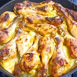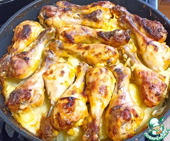 9. Выкладываем сверху куриные ножки. Их надо так разместить чтобы картошки не было видно ни грамма :D, если все-таки маленькая дырочка проглядывает промажьте в этом месте картошку майонезом или нашим приготовленным соусом.
