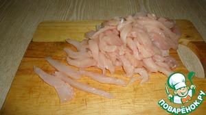 Куриное филе моем и обсушиваем полотенчиком. Нарезаем на длинную соломку. На фото хорошо видно.