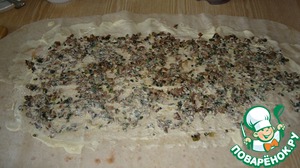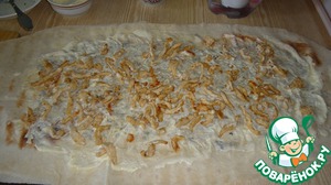 И выкладываем жаренные грибы. Равномерно распределяем их по всей поверхности.