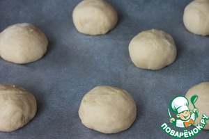 Тесто обмять, разделить его на 10 комочков по 55 грамм каждый. Сформируйте округлые булочки, положите их на противень ДАЛЕКО друг от друга, поскольку булочки очень сильно увеличатся в размере, накройте противень пленкой и поставьте булочки в теплое место на расстойку в течение 30-40 минут.