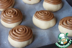 Когда булочки увеличатся вдвое, достаньте масляное тесто из холодильника и покройте им верхушки булочек так, как на фото, спиралью.