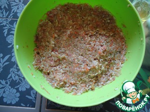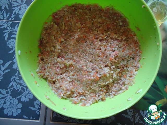 Перемалываем в мясорубке фарш, добавляем морковь, капусту, лук, укроп. И не забываем посолить.