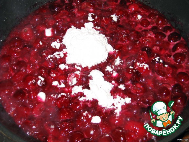 1. Растопить 30 гр масла в сковороде и положить туда вишню. Слегка ее припустить (2-3 минуты), добавить сахарную пудру (1/3 стакана) и готовить минут 5, до появления сока. Остудить.