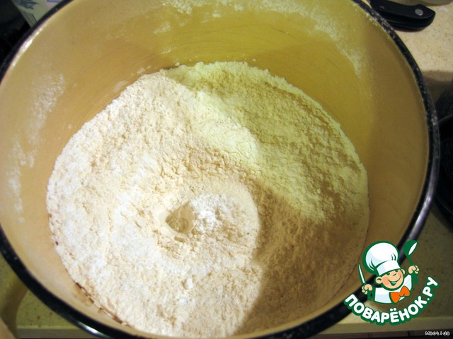 2. просеять муку, разрыхлитель, соль, ванилин, сахарную пудру (1/3стакана)