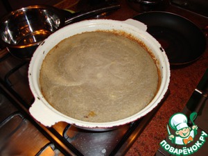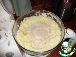 Этот пункт мы проходим быстро… к сожалению, даже неплохая мелкая тёрка в комбайне оставляет волокна картофеля (это не смертельно, но влияет на консистенцию готового продукта), поэтому после тёрки я пропускаю картофельную массу через блендер… получается довольно воздушная масса… переливаем её в утятницу (у меня – чугунная эмалированная… в принципе, подойдёт любая толстостенная посуда с крышкой, которую можно ставить в духовку).