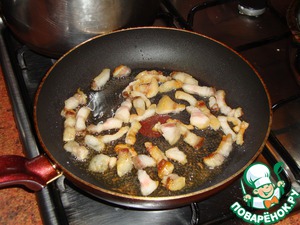 И жарим её на сковороде до золотистого цвета (здесь могут быть варианты: некоторые любят поджаристые шкварки с хрустящей корочкой, некоторые - более мягкие кусочки) так что, тут определяйтесь сами)…