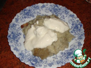 В картофельную массу, которую мы положили в утятницу, добавляем сметану и кефир, перемешиваем…
