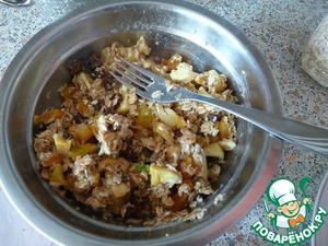 Строгаем сухофрукты. За это время как раз хлопья чуть пропитаются бананом (особенно если он спелый)