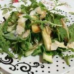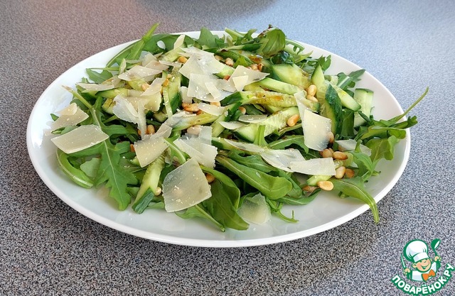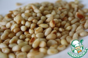 Полить заправкой салат, затем посыпать орешками, сыром. -