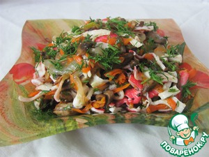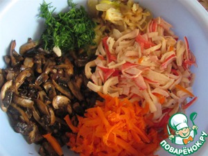 Нарезаем все ингредиенты соломкой:грибы и крабовые палочки, лук-полукольцами. Морковь отвариваем, очищаем и трём на крупную тёрку.