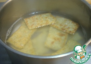 Тесто на присыпанной мукой поверхности раскатать толщиной 0,3-0,5 мм, разрезать на прямоугольники 5х4 см.