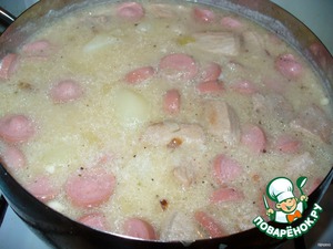 Когда сварится картошка, слить немного воды, оставить отвара по Вашему вкусу (можно и вовсе не сливать - будет больше бульона). Добавить мясо, сосиски, лук в сметане и ввести муку. (Я предварительно ее размешиваю в небольшом количестве отвара). Потушить минут 5. Досолить по вкусу, поперчить (перца должно быть много). Всё готово!