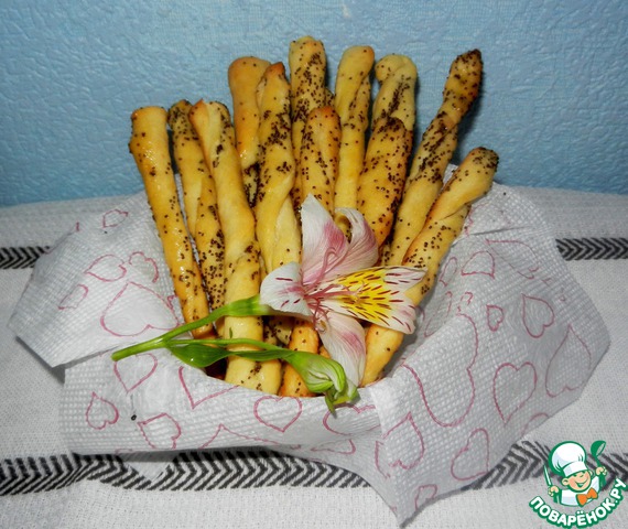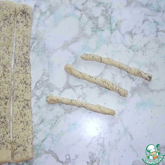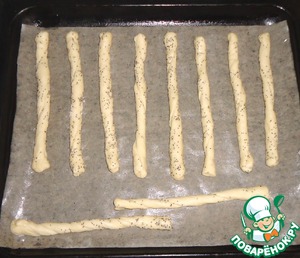 Противень застелить пекарской бумагой, смазать растительным маслом, выложить палочки из теста и выпекать при температуре 180 градусов 10 - 12 минут.