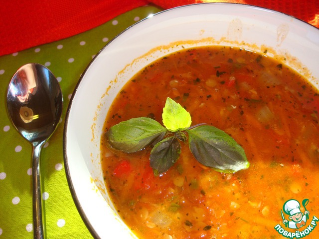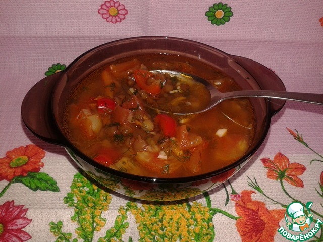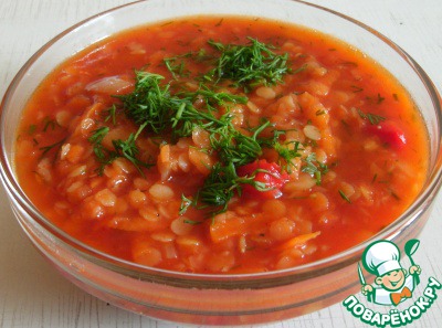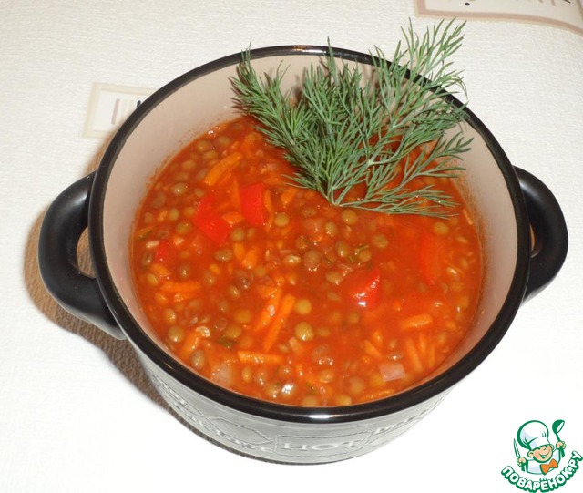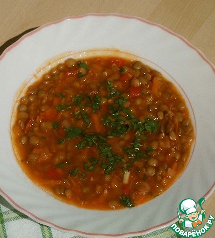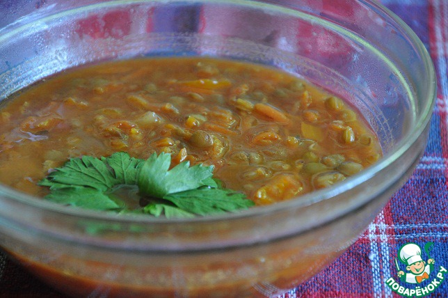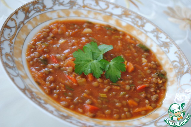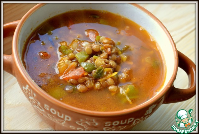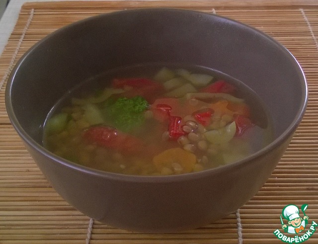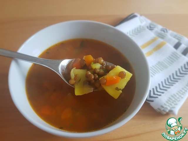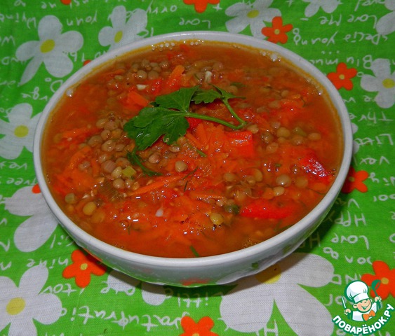 Низкокалорийный и сытный суп. В 100 гр 41 ккал (моё приблизительное значение). Если подсчитываете ккал, необходимо подсчитать своё приготовленное блюдо. Время приготовления дано без учёта замачивания чечевицы.