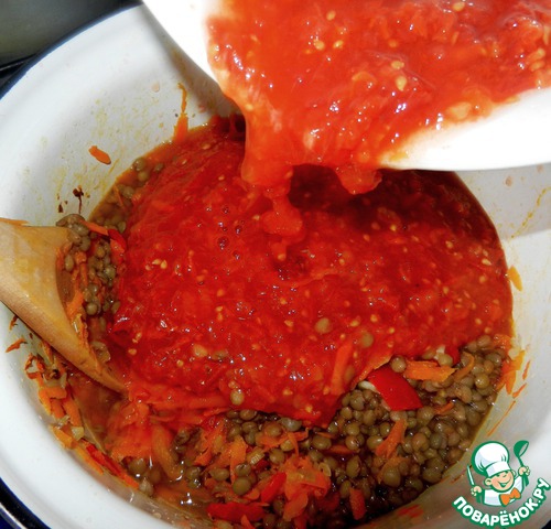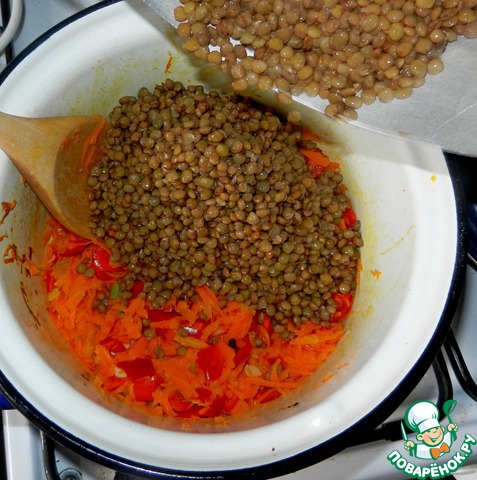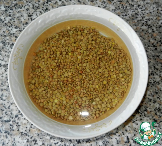 Чечевицу перебрать и замочить в холодной воде на 1 час. Затем воду слить, а чечевицу отварить в двух стаканах воды до полуготовности около 30 минут. Я брала зелёную чечевицу, время её приготовления 40-50 минут.