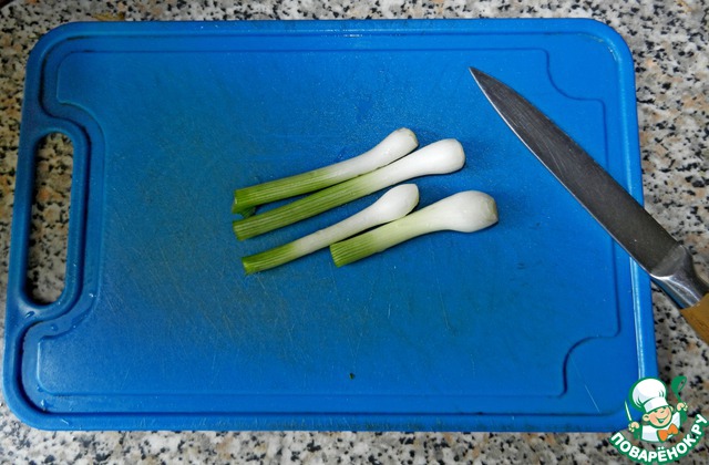 Подготовить овощи. Лук мелко нарезать. Я брала белые кончики зелёного лука, любой лук подойдёт.