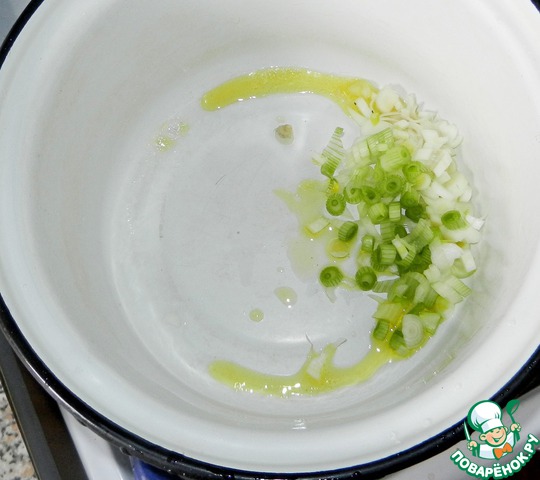 В кастрюлю влить 2 ст л оливкового масла, немного обжарить лук.