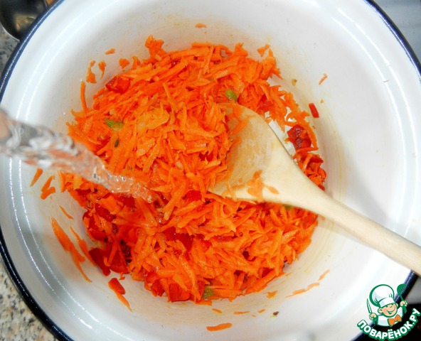 Добавить сладкий перец и морковь, также немного обжарить и влить 0,5 стак воды. Потушить 7 минут.