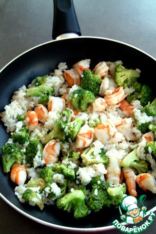 • На оливковом масле обжарить брокколи до полу-готовности, добавить нарезанные креветки и рис. Посолить, поперчить.