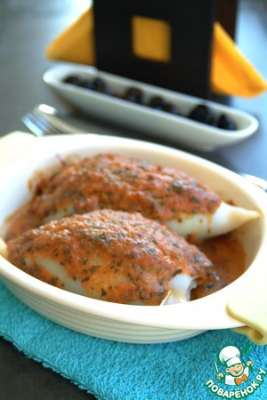• Фаршированные кальмары полить соусом. Запечь в духовке 17 минут при 200*, затем включить режим конвекции и допечь еще 3 минуты.