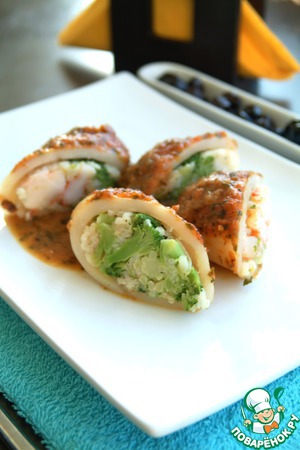 Рецепт: Кальмары с рисом, креветками и брокколи