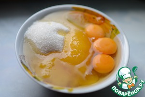 В отдельной миске хорошо растираем яйца, сахар и мёд. Добавляем к основной массе и хорошо вымешиваем ложкой, чтобы не было комочков, или просто взбиваем миксером.