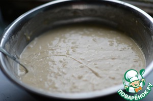 Тесто по консистенции получается как не очень густая сметана. На картинке, может, это трудно рассмотреть. В конце добавляем в тесто промытый и обтрушенный мукой изюм (изюм обтрушиваем мукой, чтобы не осел при выпекании на дно). Даём тесту постоять 20 минут.