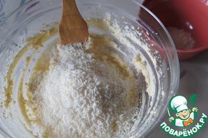 Добавить последовательно белый шоколад, натертый на мелкой терке, ваниль и кокосовую стружку, оставив немного кокоса для украшения. Хорошо перемешать тесто.