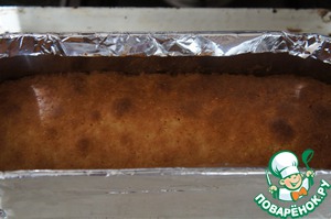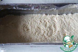 В небольшую форму для торта или кекса уложить пергаментную бумагу, смазать маслом, выложить тесто, разровнять поверхность. Я использовала длинную узкую раздвижную форму шириной 10 см. Длину установила 30 см. Дна у нее нет, поэтому я обернула ее фольгой.