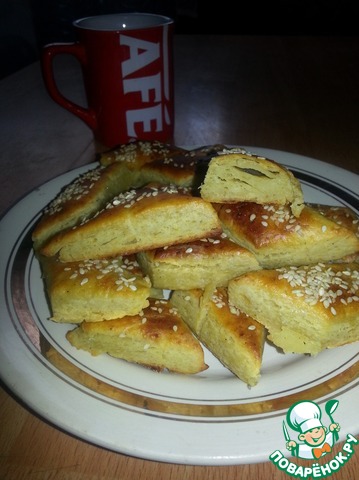 И разрезать его на ромбики. Смажем белком и посыпем кунжутом. Можно маком или солью, это на вашу фантазию. Ставим в духовку на 20 минут, при 190 гр, главное не пережарить.