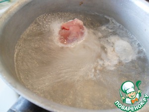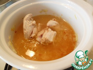 В отдельной кастрюле сварить курицу, разрезанную на порционные куски. Воды при варке потребуется 2-2,5 л.