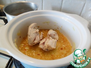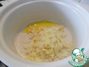 В кастрюлю с толстым дном влить растительное масло и жир от курицы, который можно снять с бульона при ее варке. Обжарить мелко нарезанный лук.