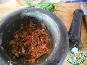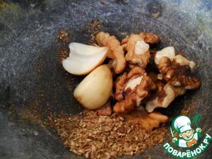 В ступке растолочь специи и добавить грецкие орехи и чеснок.