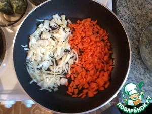 Чистим и мелко режем лук и морковь, выкладываем на сковороду в подсолнечное масло. Можно потереть на крупной терке, но именно кусочки моркови придают красивый оттенок и легкую сладость готовому блюду.