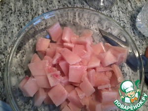 Пока овощи жарятся, а рис с чечевицей варятся, режем курицу. Мое филе было еще немного подмороженным, поэтому легко порезалось на ровные квадратики.