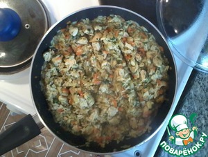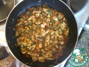 Добавляем к овощам курицу, обжариваем до готовности. Так как кусочки мяса небольшие - обжарятся минут за 5.