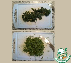 Режем зелень (я брала укроп) и шпинат, добавляем в сковороду к уже поджаривающимся луку и моркови.