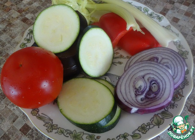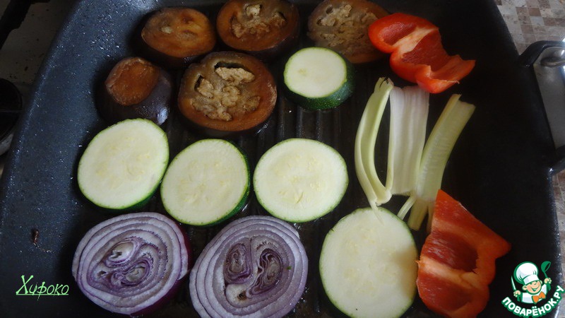 Овощи разложить на сковороде-гриль и обжарить на том же масле, на котором жарили мясо.
