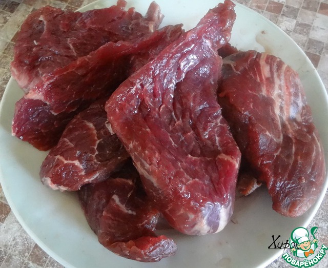 Помыть, обсушить и порезать поперёк волокон говяжью вырезку толщиной 1 см.
