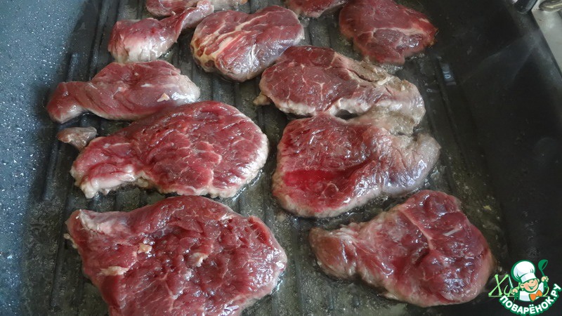 Кусочки мяса разбить кулаком до толщины 0,5 см. налить в сковороду-гриль растительное масло. хорошо его разогреть и только после этого положить мясо и обжарить с двух сторон по 3 мин. мясо вытащить, отложить в сторону.