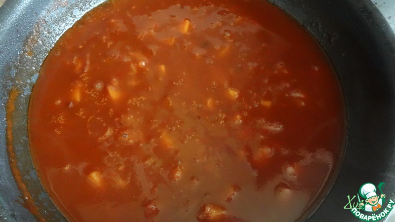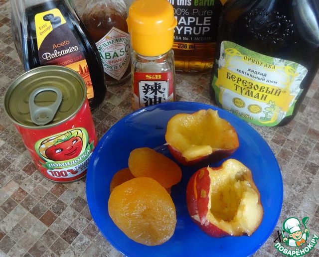 Для соуса я взяла томатную пасту, бальзамический уксус, кленовый сироп вместо сахара (это не принципиально), Красный острый перец в масле (можно молотый), соус "табаско", Жидкий дым и соль. Три кураги, и один маленький нектарин.