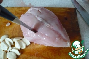 Куриную грудку промыть снять кожу и сделать небольшие прорезы (не до конца ) по всей грудки. Чеснок почистить и порезать на тонкие пластины.