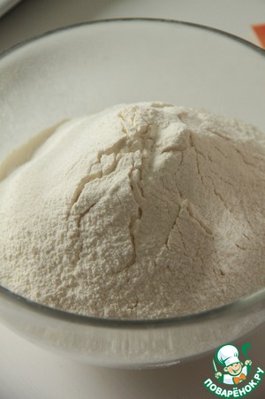 В муку добавить пакетик разрыхлителя и все вместе просеять в отдельную посуду.