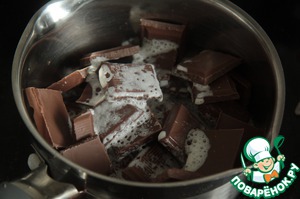 Приготовим начинку. Растопим 300 гр шоколада и 150 мл сливок.