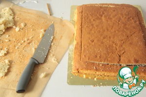 Дальше начинается ювелирная работа. Достаем наш корж, разрезаем его вдоль пополам, а затем отступаем от края 1 см и вырезаем прямоугольник. Вынимаем крышку.