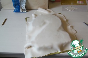Посыпаю стол крахмалом, аккуратно раскатываю мастику и укладываю на торт.
