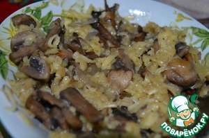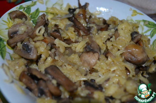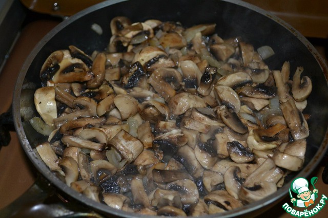 3. Жарим грибы с нарезанным луком до 10 минут. Солим и посыпаем грибной приправой или же перцем. На счет добавления масла, то тут все зависит от вашей сковороды, если она позволяет, то можно жарить и без него, но если добавить 2 столовых ложки оливкового масла, то и оно лишним не будет.