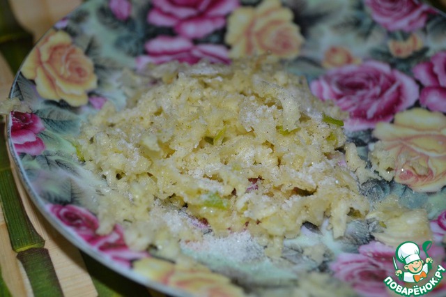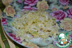 5. Давим 5 зубчиков чеснока и смешиваем с щепоткой соли.