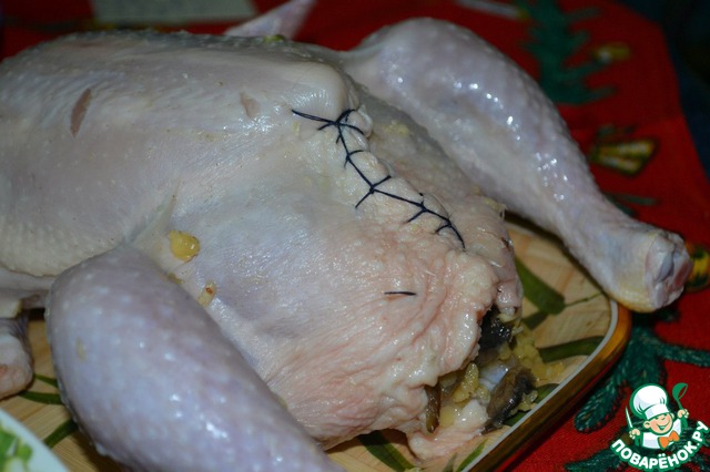 6. Фаршируем курицу сырно-грибной смесью, зашиваем курицу нитками или же при их отсутствии закалываем зубочистками. Натираем курицу грибной приправой и давленным чесноком.